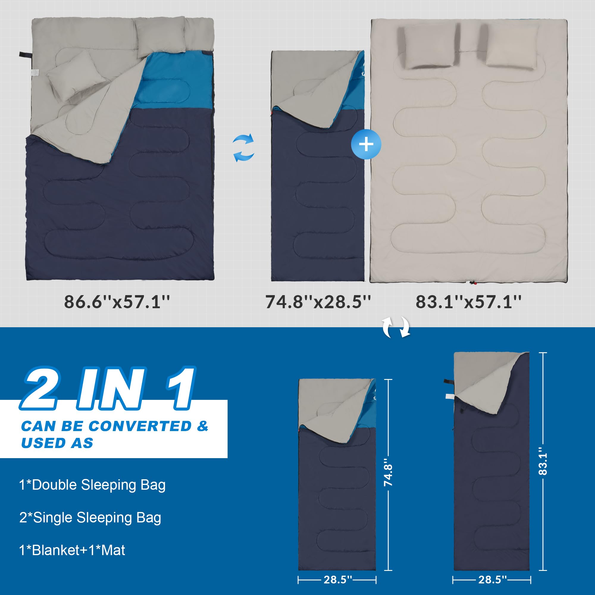 - Convertible Sleeping Bag: Queen size double sleeping bag is effortlessly transforms with zipperāuse it as a spacious double bag with 2 pillows for cozy nights or detach into two individual sleeping bags. Perfect for camping, it also unzips completely into two large blankets or mats for picnics, outdoor events, for home lounging, offering unmatched flexibility for any adventure or relaxation need